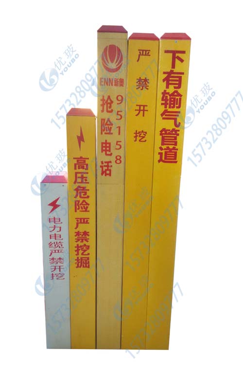 我們?cè)诠╇姟㈦娎|、天然氣等場(chǎng)所經(jīng)常會(huì)看到各種標(biāo)志樁,一塊好的標(biāo)志樁能清楚的的告訴大家這里有什么,比如:此處有燃?xì)夤艿溃〉叵码娎| 嚴(yán)禁挖掘!提醒我們?cè)谑┕ぷ鳂I(yè)時(shí)要避開此處。從而避免很多不必要的麻煩和損失。標(biāo)志樁長(zhǎng)年累月置于露天處,風(fēng)吹日曬,有時(shí)還要面臨酸堿性的雨水侵蝕,這就要求標(biāo)志樁有著極其強(qiáng)的耐腐蝕性和抗撞擊性。而優(yōu)玻標(biāo)志樁有著很高的抗壓性能和較長(zhǎng)的使用壽命,其耐腐蝕性也是相當(dāng)強(qiáng)悍的,一般情況下可以使用至少30年以上,而且價(jià)格便宜。我公司專門生產(chǎn)標(biāo)志樁產(chǎn)品,想了解更多信息請(qǐng)聯(lián)系我們!15732809777